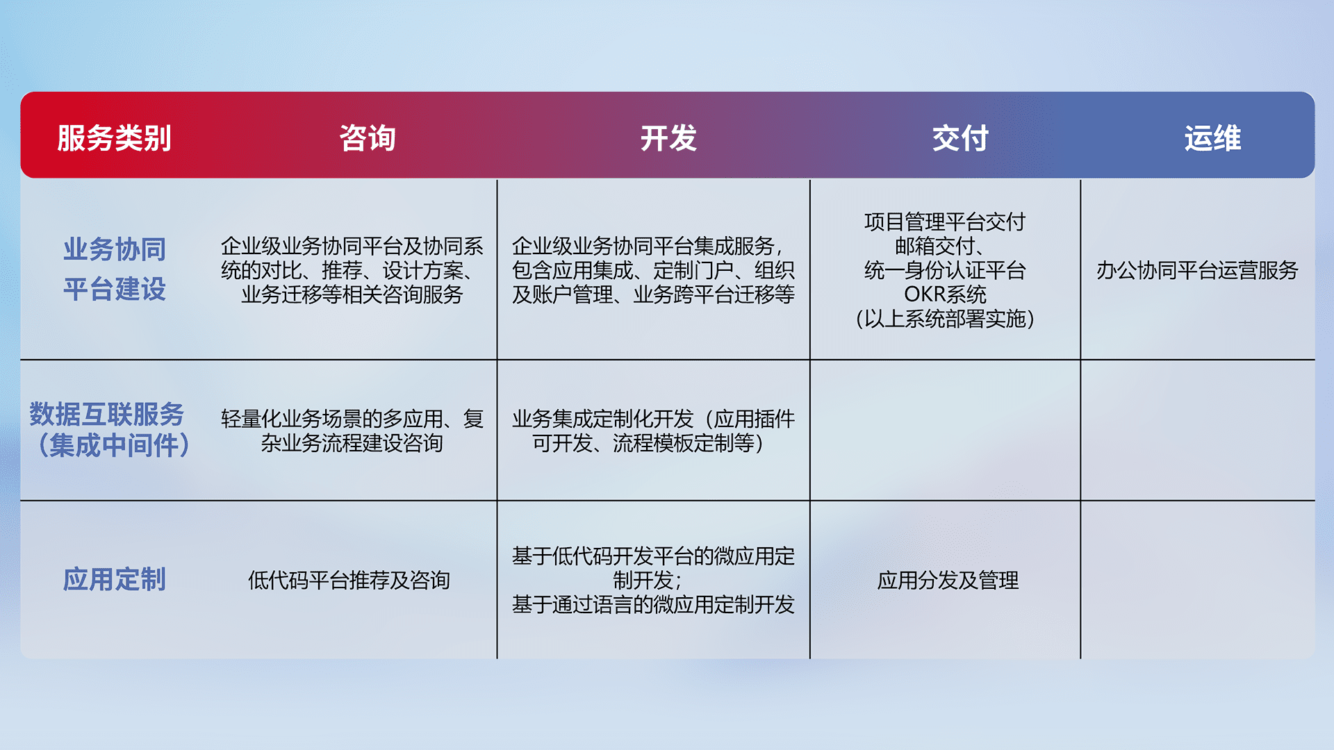 针对钉钉、、企微、、、、IDaas等平台级产品提供产品的规划、、、方案、、交付、、定制化开发等服务,,,实现如统一协同办公、、智能客户服务、、、混合会议管理、、智能数据查询、、、等业务场景,,实现数字化转型。。